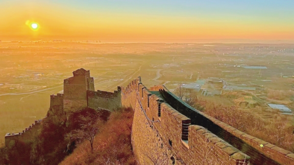 寒冬的晨雾中,旭日初升,金光洒向大地,山海关角山长城如同一条蜿蜒巨龙,沐浴在金光里,气势磅礴,伟岸雄奇。