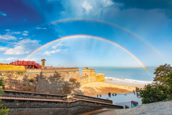 骤雨初歇,雨霁云开,两道彩虹自海面跃出,如两道彩练将山海关老龙头古城墙轻轻环抱。此刻,长城这入海的巨龙正昂首虹幕之间,斑驳的垛堑与绚烂的虹弧构成一幅美丽的图景。
