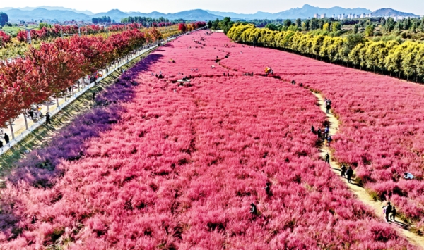 金秋十月,抚宁区宁海大道北侧的粉黛乱子草迎来盛花期,粉色花穗如云雾铺展,人们穿梭在观赏步道间,欢声笑语与绚烂花海相映成趣,交织成城市秋日里最浪漫的风景线。