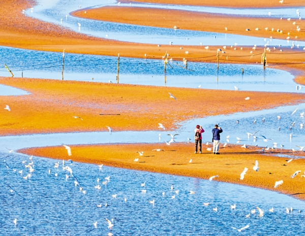 初冬时节,北戴河大潮坪褪去喧嚣。无数鸥鸟在辽阔的沙滩上翔集、嬉戏。海水不似夏日汹涌,带着清冷力道,在沙滩上熨开道道波纹。观海的人们拿出相机、手机,定格下沙软潮平、人鸟共生的和谐画面。