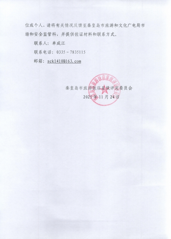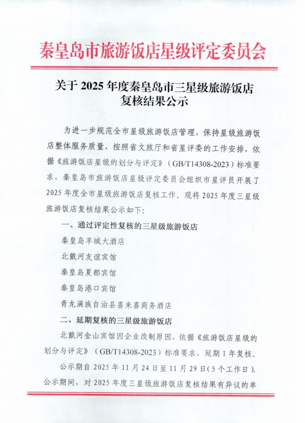 关于 2025年度秦皇岛市三星级旅游饭店复核结果公示