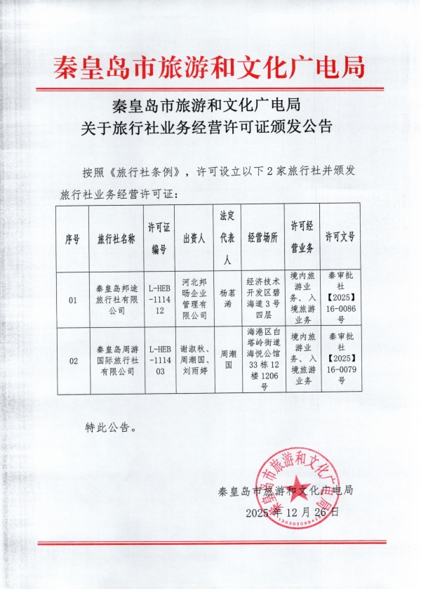 秦皇岛市旅游和文化广电局关于旅行社业务经营许可证颁发公告(2025年12月)