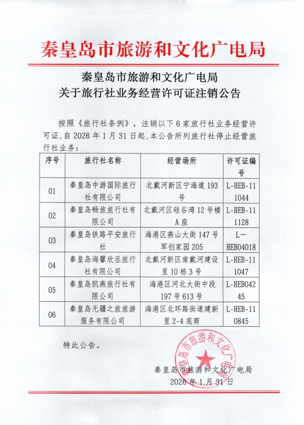秦皇岛市旅游和文化广电局关于旅行社业务经营许可证注销公告(2026年1月)
