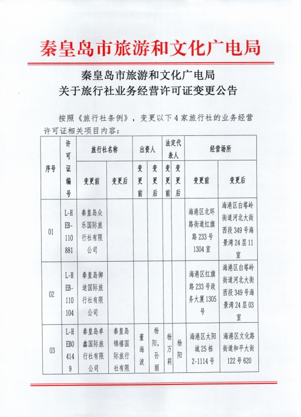 秦皇岛市旅游和文化广电局关于旅行社业务经营许可证变更公告(2026年1月)