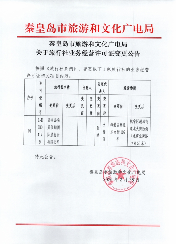秦皇岛市旅游和文化广电局关于旅行社业务经营许可证变更公告(2026年2月)
